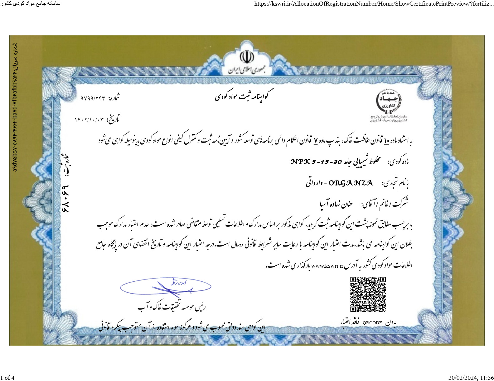 ارگانزا 30-15-5 ترکیب ایده آلی از کود شیمیایی و کود آلی با مقادیر بالایی از عناصر ماکرو (NPK) است.همچنین شامل ترکیبات آمینو اسیدها و فولویک اسید است.این محصول سرشار از عناصر ریزمغذی است که تغذیه مناسب تری را برای گیاهان فراهم می آورد
